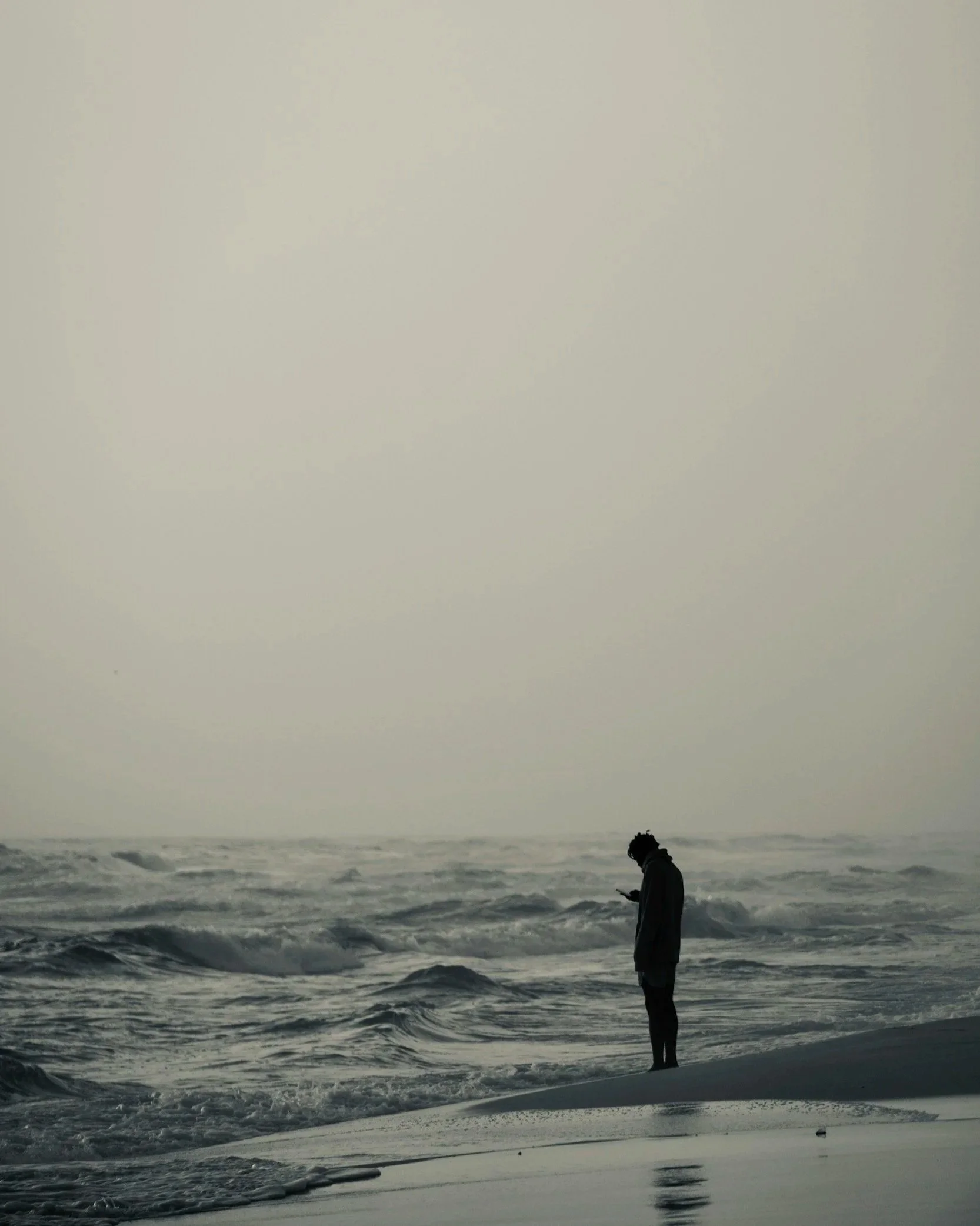 A man at the ocean looking at their phone appears disconnected from nature and focused on their phone