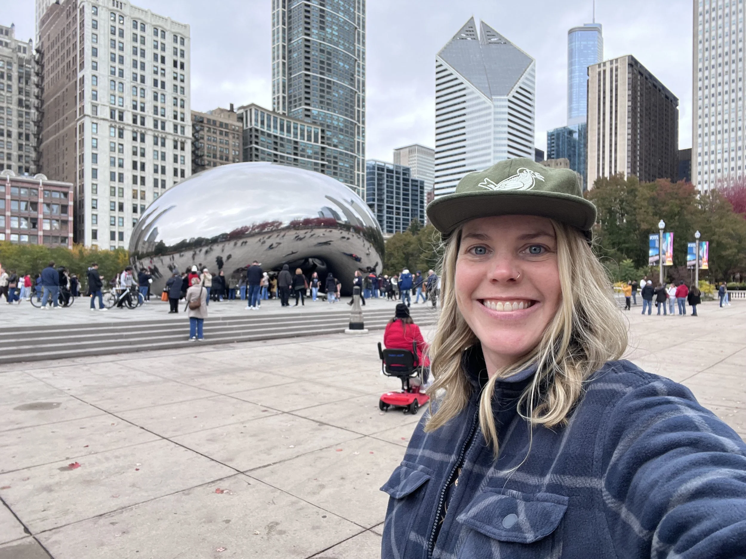 Selfie of Amanda with the Chicago Bean and Skyline behind her on a brisk, cloudy, Chicago morning in November 202